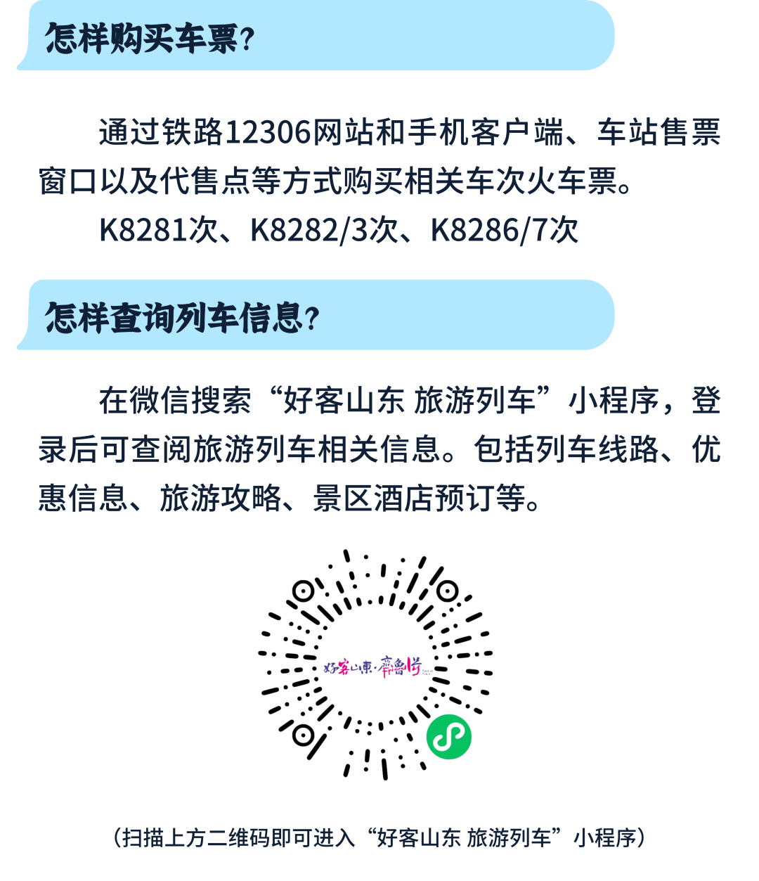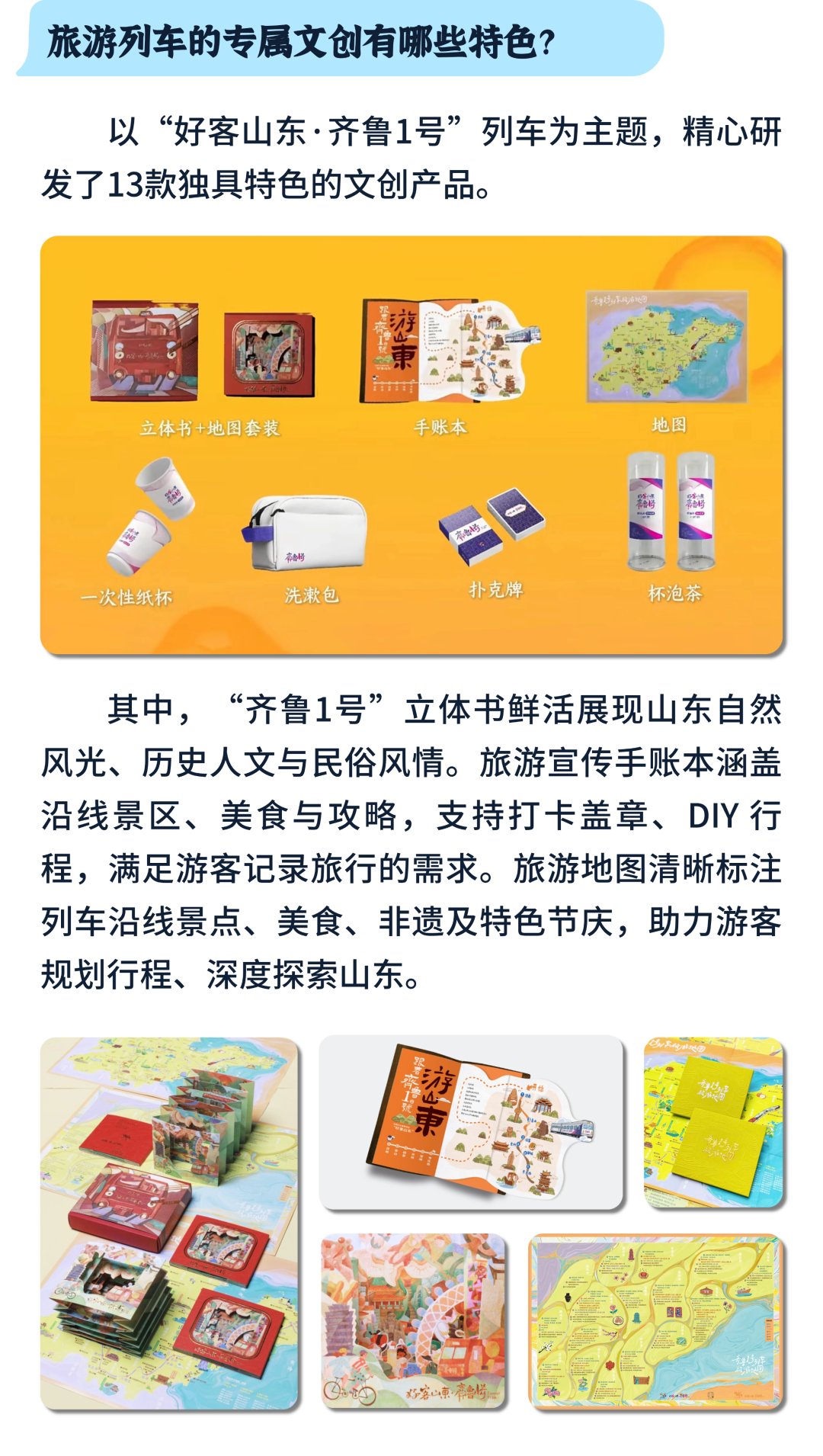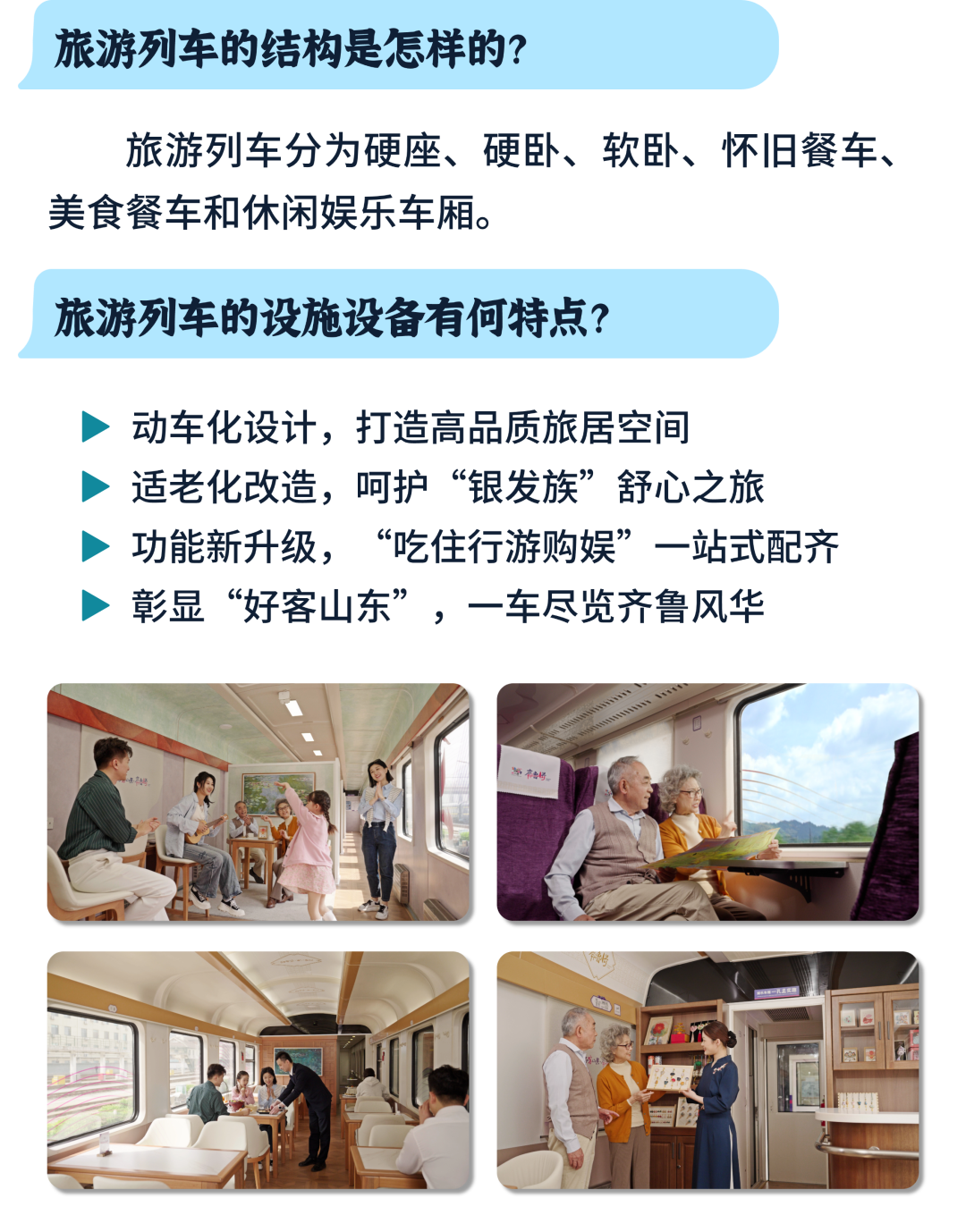 收藏!“好客山东·齐鲁1号” 旅游列车出行指南 大众报业·齐鲁壹点 2025-04-10 5265 “好客山东·齐鲁1号” 旅游列车已经 鸣笛启程啦! 沿线停靠哪些站点? 文旅元素有哪些? 特色美食又有哪些种类? 乘坐列车的旅客又能享受哪些优惠? 收下这份出行指南 解锁超多惊喜: “好客山东·齐鲁1号” 旅游列 车的亮点 相信你已全部get啦! 登上列车 ,一起去探索齐鲁大地, 开启一场 难忘旅程吧 ! (文旅山东) 责任编辑:张宇宁