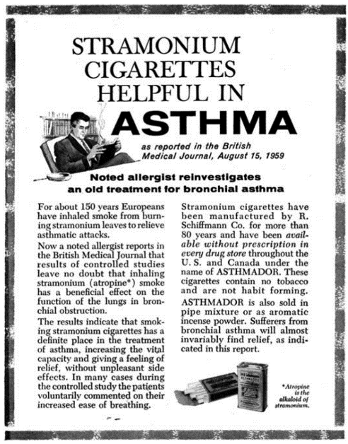 1959年美国某杂志上针对哮喘患者的曼陀罗花香烟(含阿托品)广告