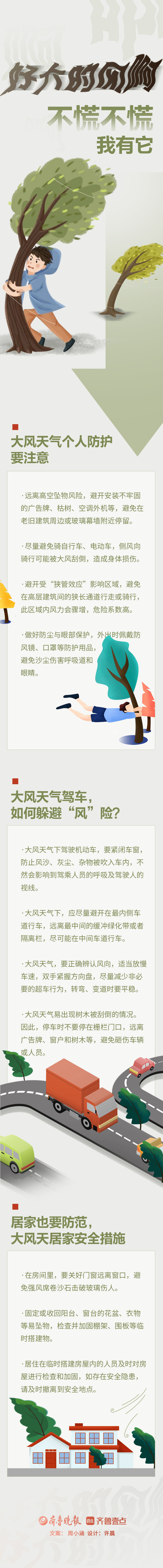 长图壹站|好 大 的 风 啊 !不慌不慌,我有它→ 长图壹站 2025-04-11 3385 齐鲁晚报·齐鲁壹点 周小涵 许晨 据中央气象台 受较强冷空气影响 今起三天(4月11日至13日) 我国中东部天气十分复杂 强降温、强雨雪、强对流、大风、沙尘纷纷登场! 大风天气 给生产生活和交通出行造成不利影响的同时 火灾等意外伤害的风险也会大大增加 在大风天如何避险? 别慌!这份安全指南请收好 ↓↓↓ 责任编辑:周小涵