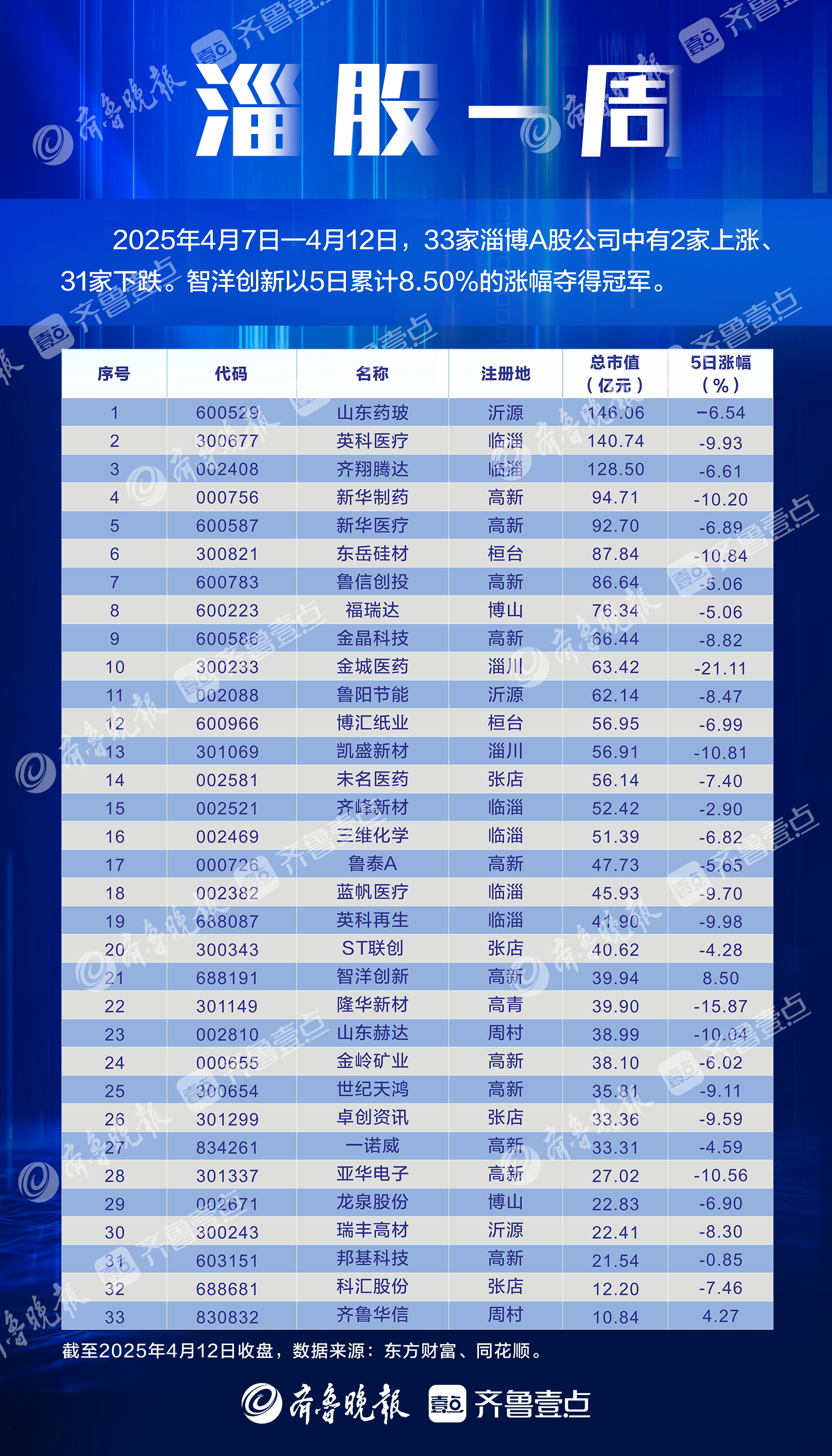 在此背景下,本周33家淄博A股公司中有2家上涨、31家下跌。智洋创新以5日累计8.50%的涨幅夺得冠军。另外,齐鲁华信5日累计上涨4.27%。