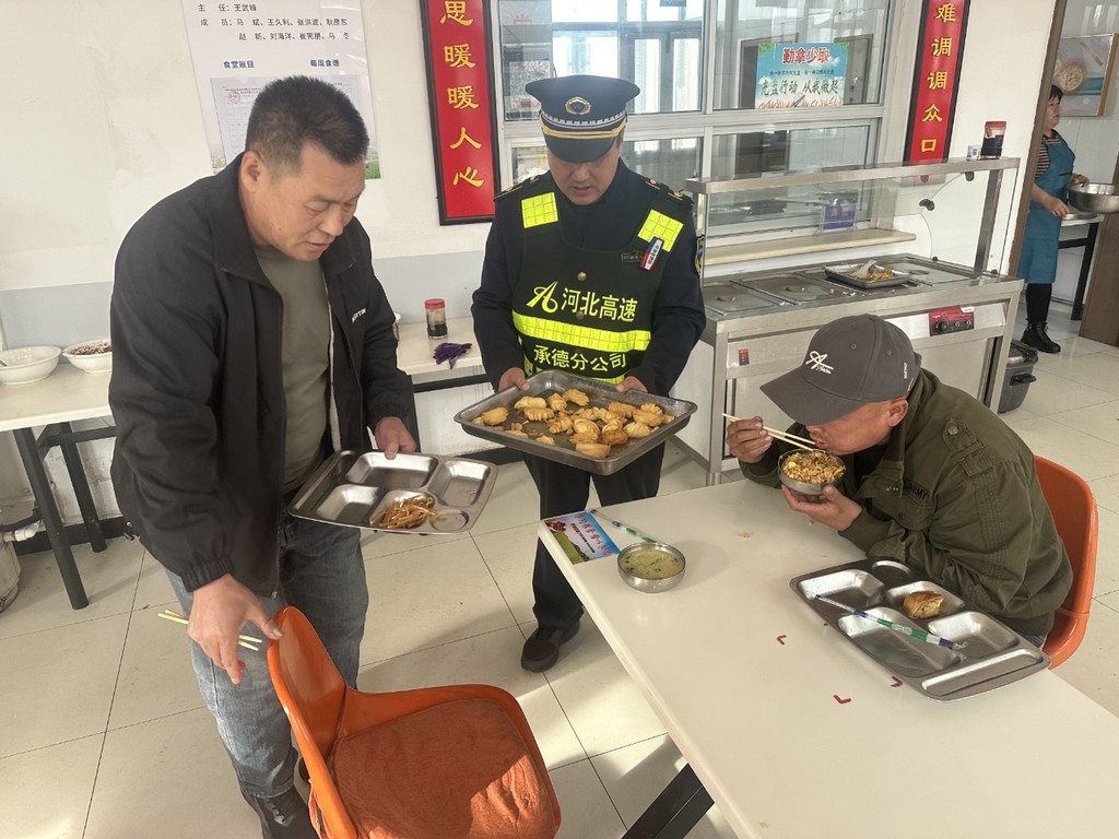 因车上食物所剩无几,第二天清晨,两人在车旁东张西望,寻找早餐店。平泉收费站值班人员细心地留意到了两名司机的困境,便主动上前询问司机车上是否备有充足食物。当得知车上没有食物时,立刻邀请司机前往食堂就餐。