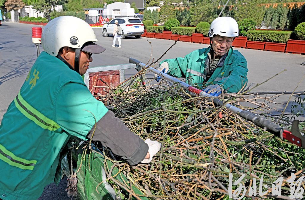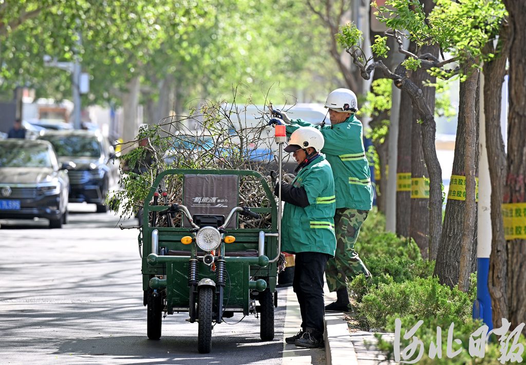 4月12日,石家庄市园林工人沿中山西路清理大风过后产生的散落断枝,保障市民出行安全。河北日报记者 张昊摄