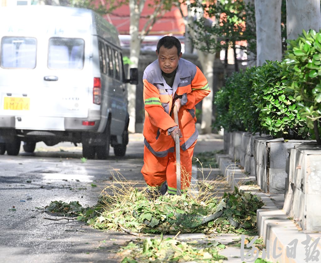 4月12日,环卫工人在石家庄市华新路清扫大风吹落的断枝落叶。河北日报记者 贾恒摄