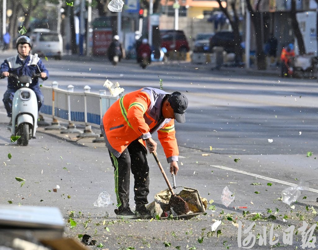 4月12日,环卫工人在石家庄市建设大街清扫落叶和垃圾。河北日报记者 贾恒摄