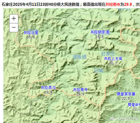 河北日报客户端4月11日讯(记者张晓超)石家庄市气象服务中心官方微博23:58发布天气实况信息:井陉出现11级大风,最高值出现在井陉南寺,风速29.9m/s。