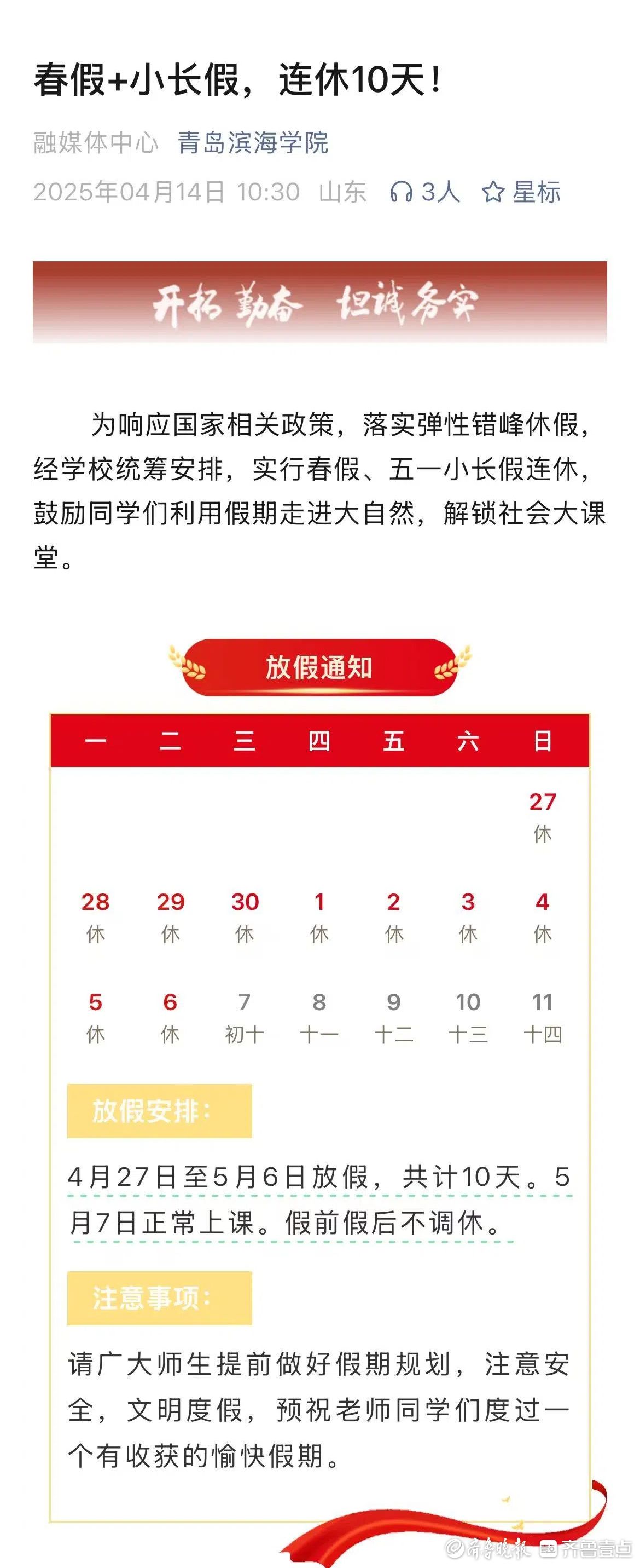 青岛滨海学院称,为响应国家相应政策,落实弹性错峰休假,经学校统筹安排,实行春假、五一小长假连休,鼓励同学们利用假期走进大自然,解锁社会大课堂。具体放假时间为:4月27日至5月6日,共10天。5月7日正常上课。假期前后不调休。