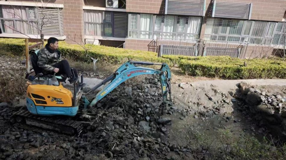 由于水系在露天环境下,清理起来是一项程序复杂的工作。清淤行动的第一步,是使用挖掘机进行大面积的淤泥清理。经过挖掘机的初步作业,大部分淤泥石子被清除,但水底仍残留着大量紧密附着的顽固淤泥。于是,工作人员用高压水枪将淤泥冲散。紧接着,用潜水泵将冲散的淤泥吸走。