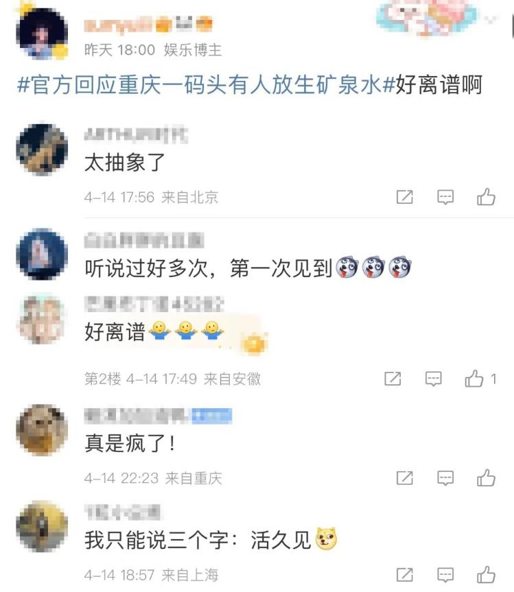 4月13日,重庆巴南区李家沱码头发生“放生矿泉水”事件,多人不停往长江里倾倒矿泉水。事件引发关注和质疑,相关话题登上热搜。