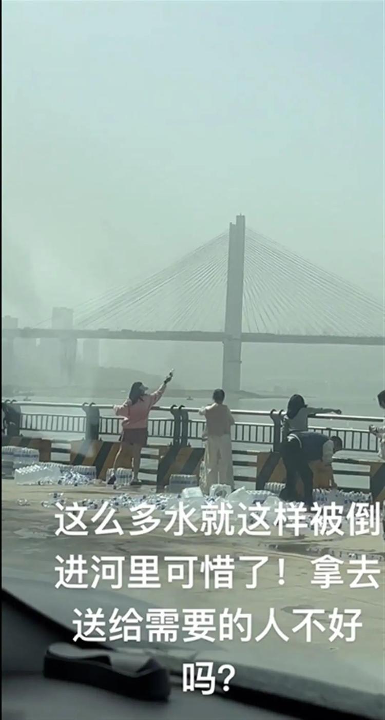 现场视频显示,在江边一处空地上,十几箱矿泉水摆放在路边,多人正不断将一瓶瓶矿泉水拧开,随后将矿泉水倒入江中,现场空矿泉水瓶散落一地。
