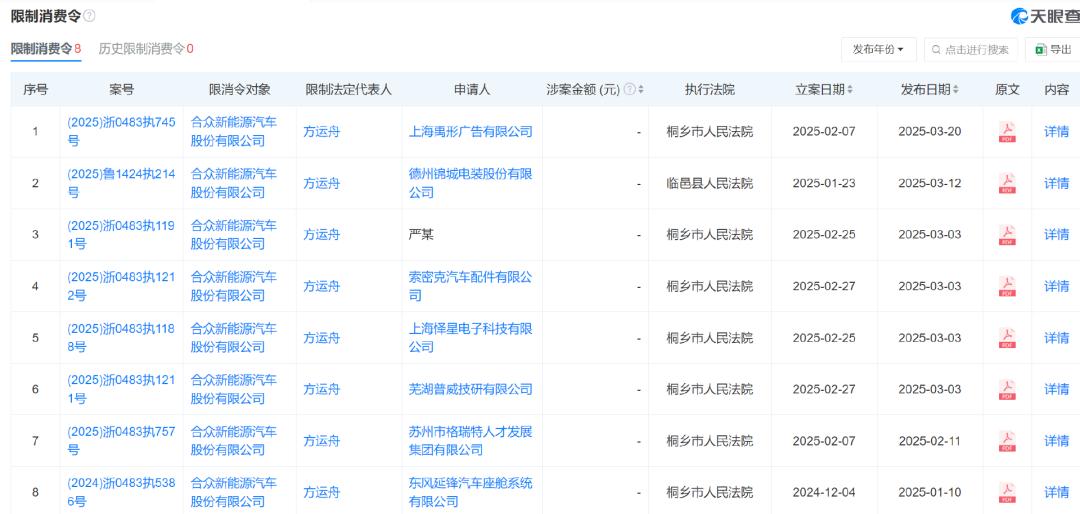 此外,还有8条被限制消费令,哪吒汽车的新任CEO方运舟作为公司法人,也被限制消费。