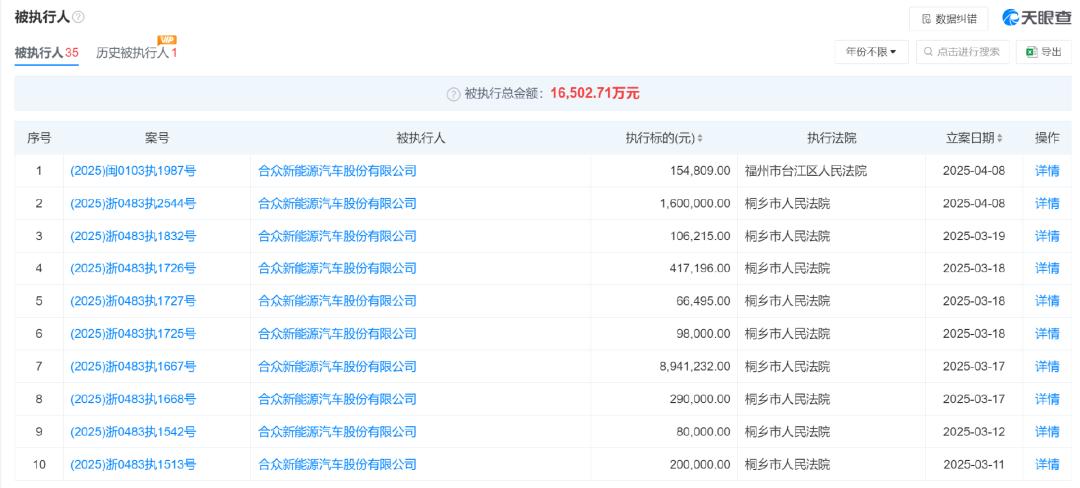 天眼查显示,截至目前,哪吒汽车的运营主体合众新能源汽车股份有限公司共有35条被执行人信息,累计被执行金额1.6亿。