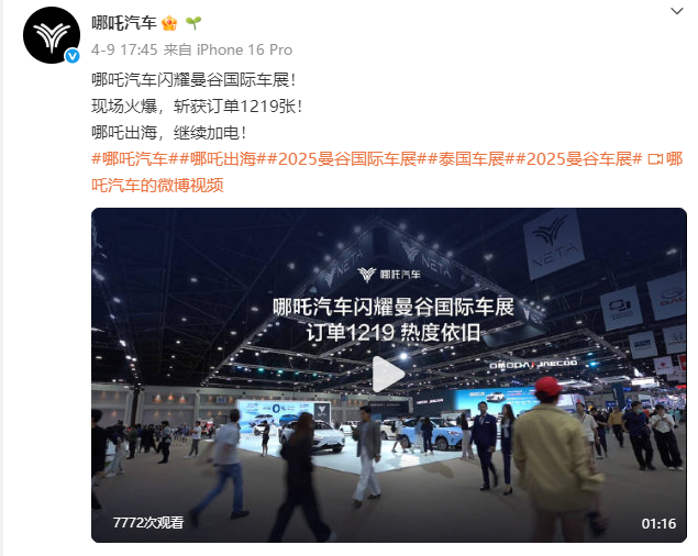 据哪吒汽车微博,在今年的曼谷国际车展上,哪吒汽车现场火爆,斩获订单1219张。