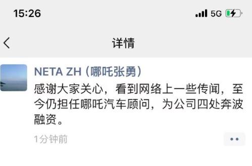 4月14日,张勇朋友圈更新,疑似回应相关传闻。张勇称:“感谢大家关心,看到网络上一些传闻,至今仍担任哪吒汽车顾问,为公司四处奔波融资。”