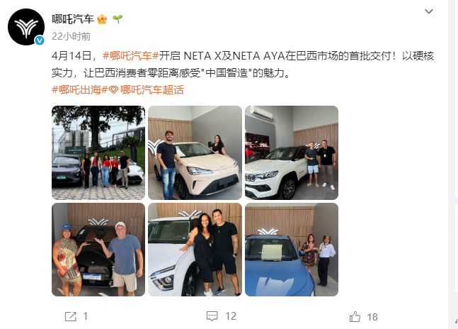 4月14日,#哪吒汽车#开启 NETA X及NETA AYA在巴西市场的首批交付!以硬核实力,让巴西消费者零距离感受"中国智造"的魅力。