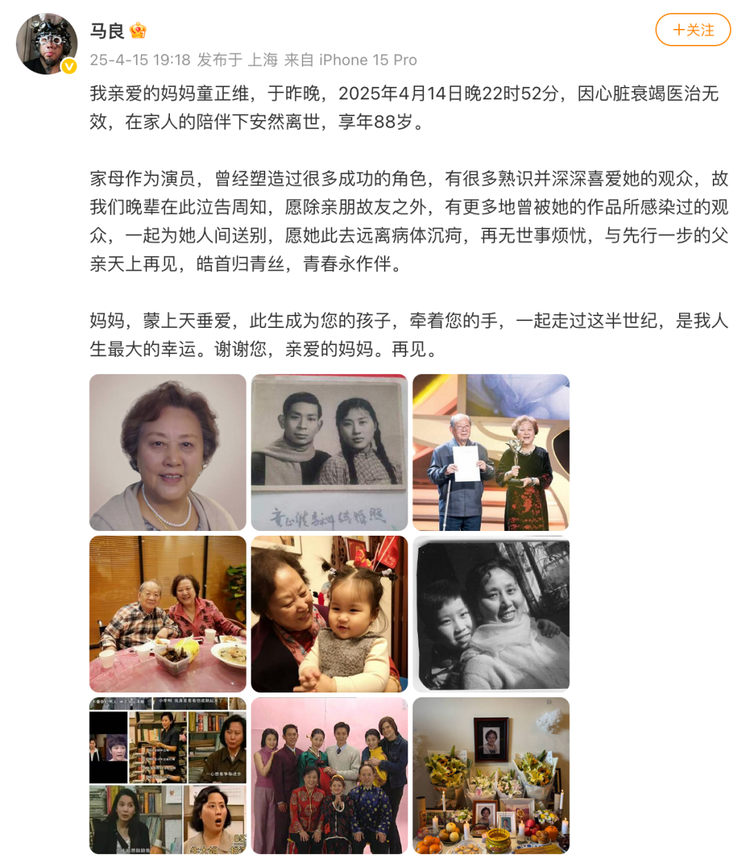 4月15日,摄影师@马良 发博称,母亲童正维于4月14日因心脏衰竭医治无效去世,享年88岁。