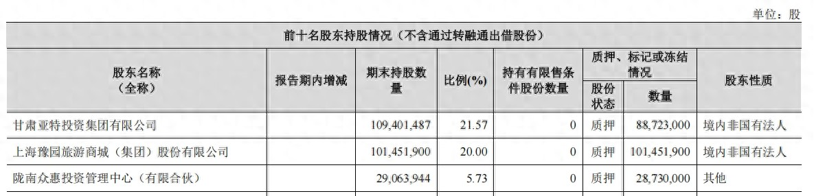另一方面,金徽酒前三大股东合计持股47.3%,都处于高比例质押状态,截至2024年末,持股21.6%的第一大股东甘肃亚特投资集团有限公司的质押股份占持股的81.1%,持股20%的二股东豫园股份(600655)质押比例100%,持股5.7%的三股东陇南众惠投资管理中心(有限合伙)质押比例98.9%。