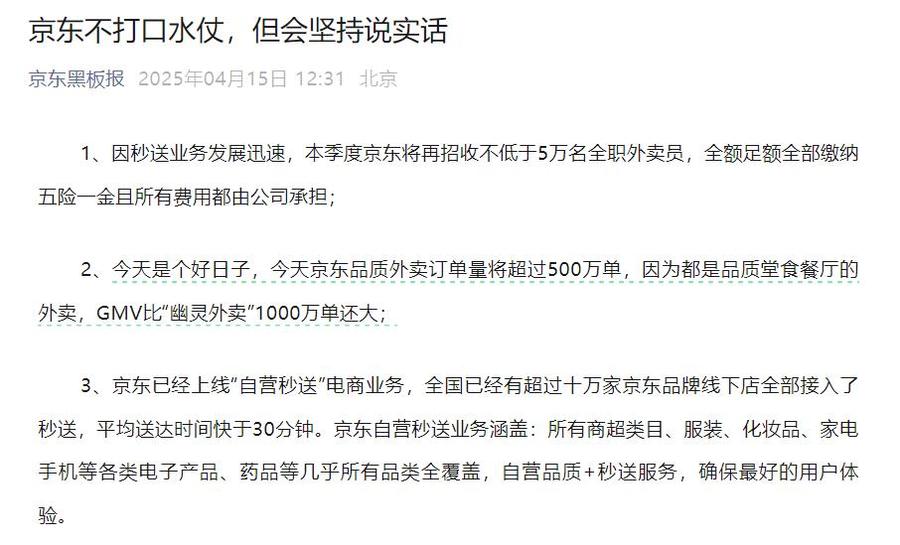 京东外卖自2025年2月11日正式上线以来发展迅速。平台承诺在2025年5月1日前入驻的商家全年免佣金,并且长期佣金率不超过5%。3月20日,京东宣布已与超10000名全职骑手签署劳动合同,并逐步落实五险一金缴纳工作。4月15日,京东表示因秒送业务发展迅速,本季度将再招收不低于5万名全职外卖员。