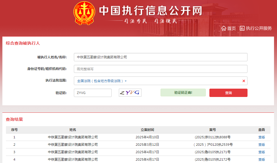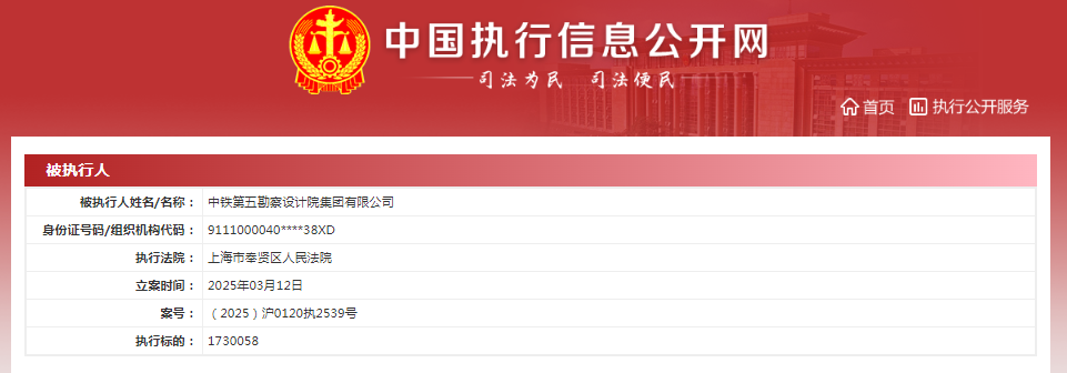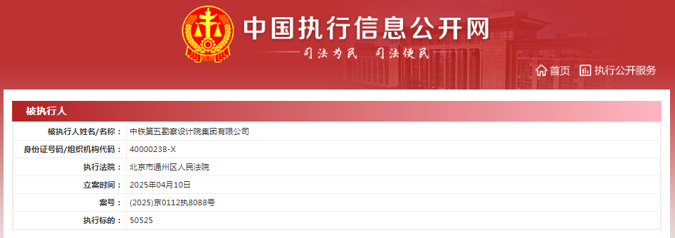 此外,在3月12日,中铁第五设计院亦被上海市奉贤区人民法院列为被执行人,执行标的人民币1730058元,案号(2025)沪0120执2539号;4月10日,中铁第五设计院被北京市通州区人民法院列为被执行人,执行标的人民币50525元,案号(2025)京0112执8088号。
