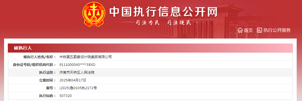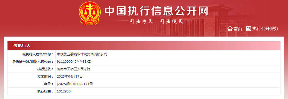 4月17日,中铁第五设计院同日新增两则被执行人信息,执行法院均为济南市天桥区人民法院。其中,案号(2025)鲁0105执2171号,执行标的1012950元;案号(2025)鲁0105执2172号,执行标的507320元。