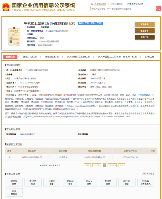 国家企业信用信息公示系统显示,中铁第五勘察设计院集团有限公司成立于2001年,注册资本17500万元人民币,法定代表人为陈虎,由中国铁建股份有限公司全资持股。