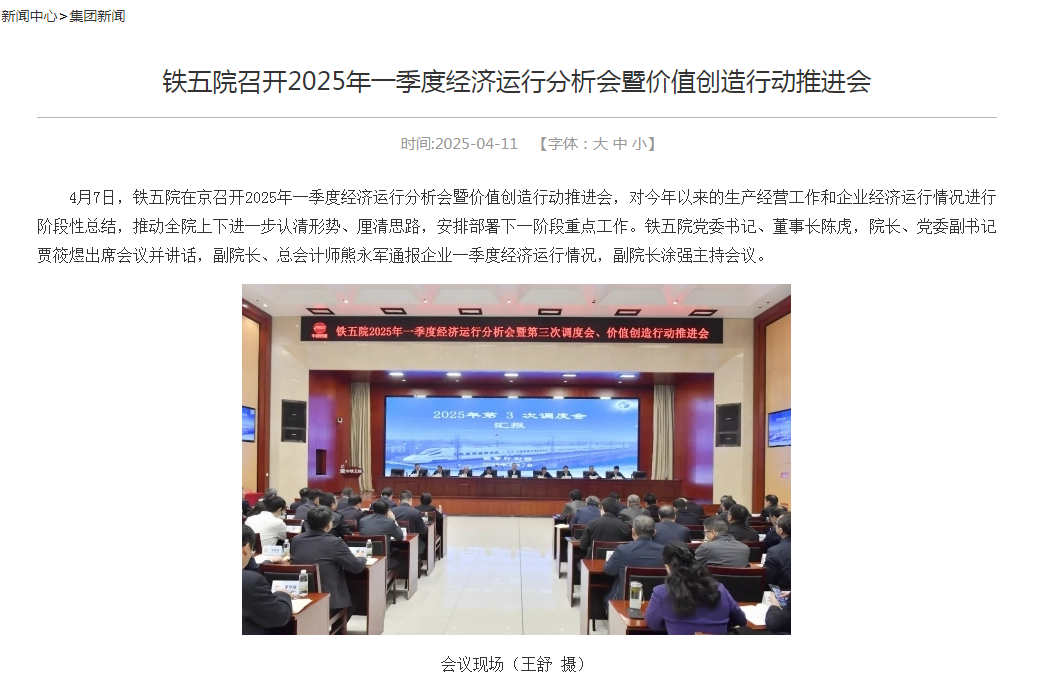 据中铁第五设计院官方网站“新闻中心”内容,4月7日,公司在京召开2025年一季度经济运行分析会暨价值创造行动推进会,对今年以来的生产经营工作和企业经济运行情况进行阶段性总结。公司党委书记、董事长陈虎,院长、党委副书记贾筱煜出席会议并讲话,副院长、总会计师熊永军通报企业一季度经济运行情况,副院长涂强主持会议。