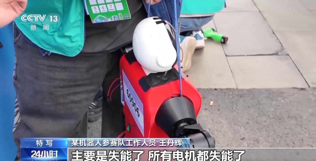 某机器人参赛队工作人员 李胜涛:我们实际上已经把它重要的零部件移到了躯干里边,主要还是因为过热的问题。所以现在头摔掉,基本上影响不是很大,我们后半程全程给它降温了。计划继续优化产品,把这个机器人做得更加稳固一点。
