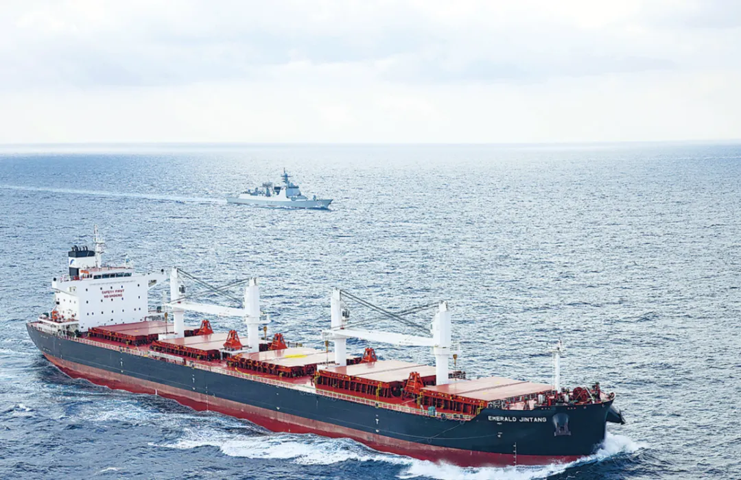 中国海军第47批护航编队包头舰在亚丁湾为商船护航