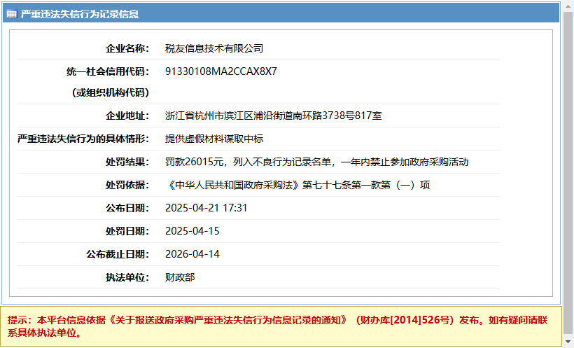 4月21日,记者从中国政府采购网获悉,税友信息技术有限公司因提供虚假材料谋取中标,被罚款26015元,列入不良行为记录名单,一年内禁止参加政府采购活动。