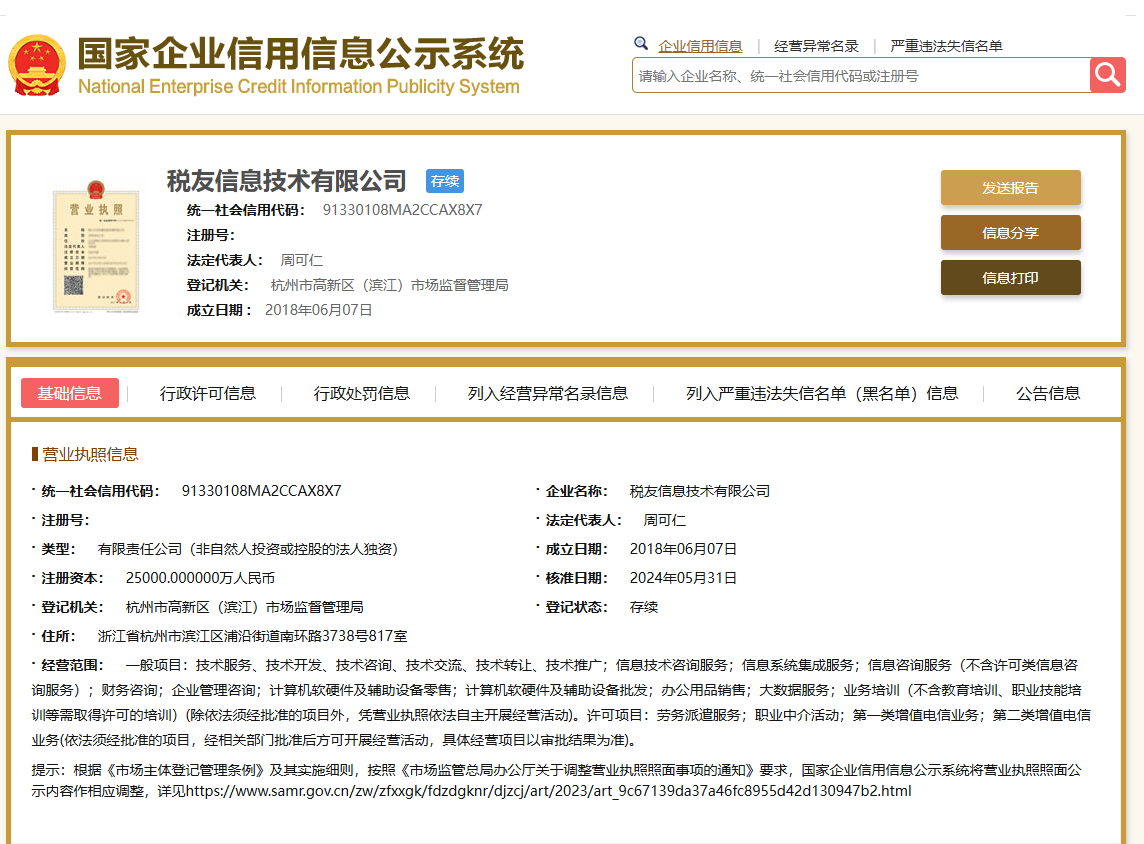 国家企业信用信息公示系统显示,税友信息技术有限公司成立于2018年6月7日,是税友股份(603171.SH)全资子公司。