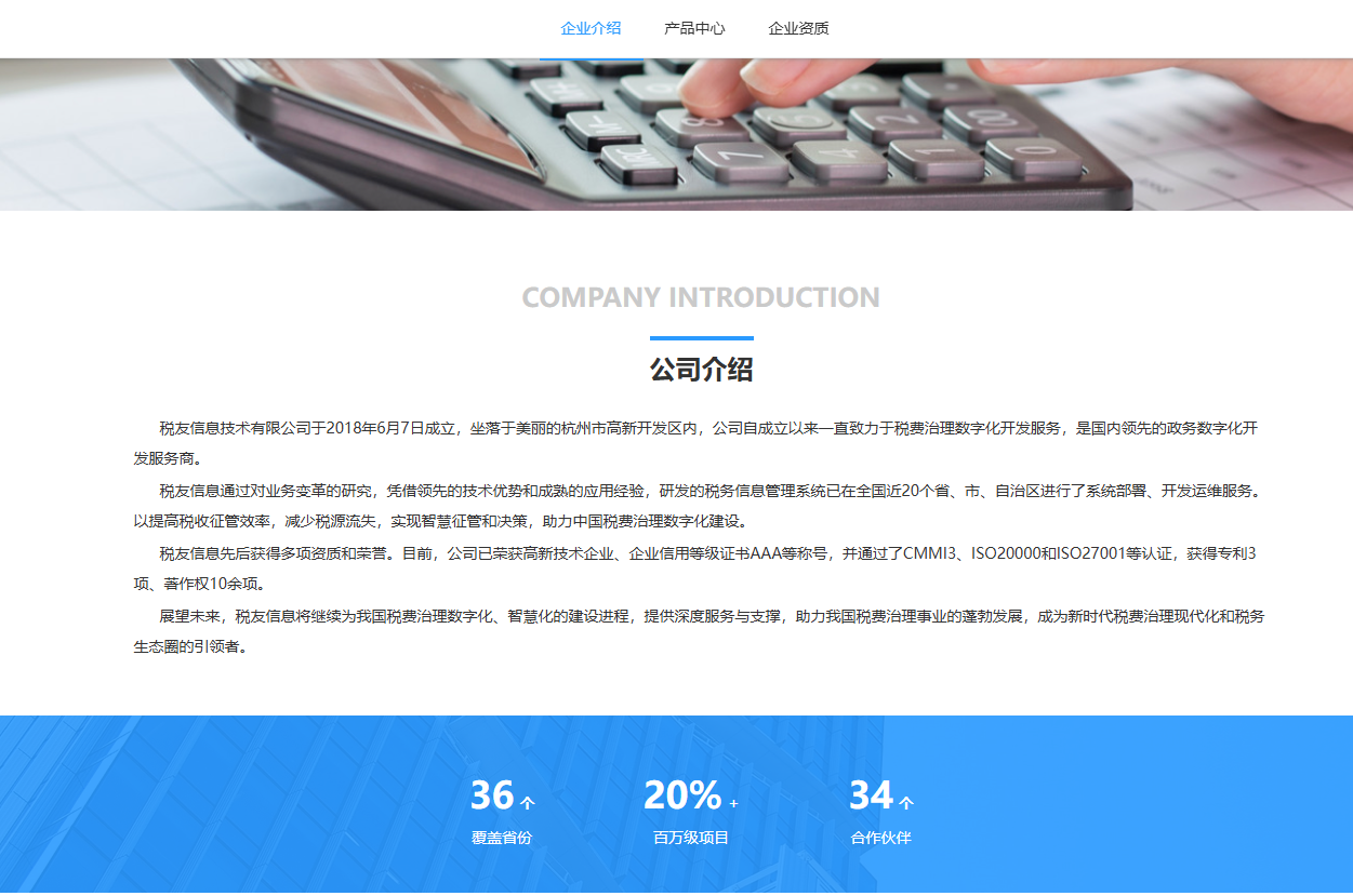 公司官网显示,税友信息技术有限公司坐落于杭州市高新开发区内,自成立以来一直致力于税费治理数字化开发服务,是国内领先的政务数字化开发服务商。