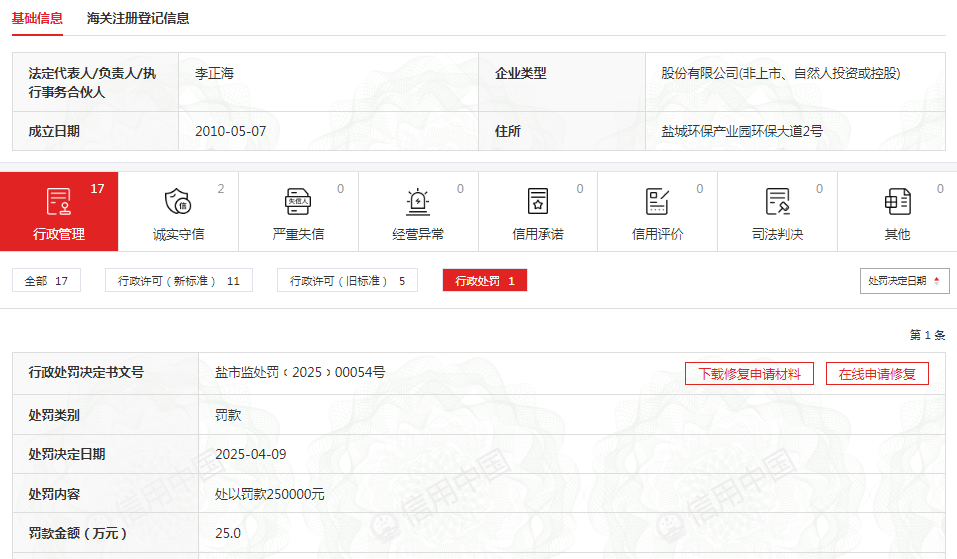 齐鲁晚报·齐鲁壹点记者于信用中国官方网站获悉,近日,江苏中科重工股份有限公司(下称“江苏中科重工”)收到罚单,处罚机关为盐城市市场监督管理局。