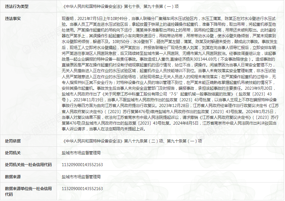 行政处罚决定书盐市监处罚﹝2025﹞00054号内容显示,江苏中科重工违法事实如下:现查明,2021年7月5日上午10时49分,当事人联箱分厂集箱车间水压试验区内,水压工蒲某、陈某正在对水冷壁进行水压试验。当事人员工严某走进水压试验区后,拿起放置于铁架上的遥控器操作起重机,准备下降吊钩,取出吊带,将起重机移至他处使用。严某操作起重机的吊钩向下运行,蒲某伸手准备取出吊钩上的吊带,因吊钩位置过高,吊带还未顺利取出。