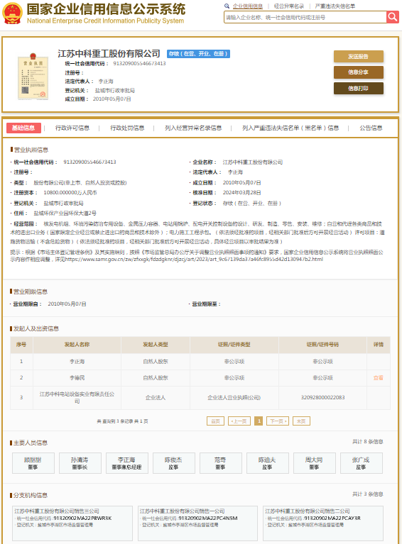 国家企业信用信息公示系统显示,江苏中科重工股份有限公司成立于2010年,注册资本10800万元人民币,法定代表人为李正海,公司大股东为盐城海瀛控股集团有限公司。盐城海瀛控股集团有限公司则成立于2012年,注册资本700000万元人民币,法定代表人为刘德坤。