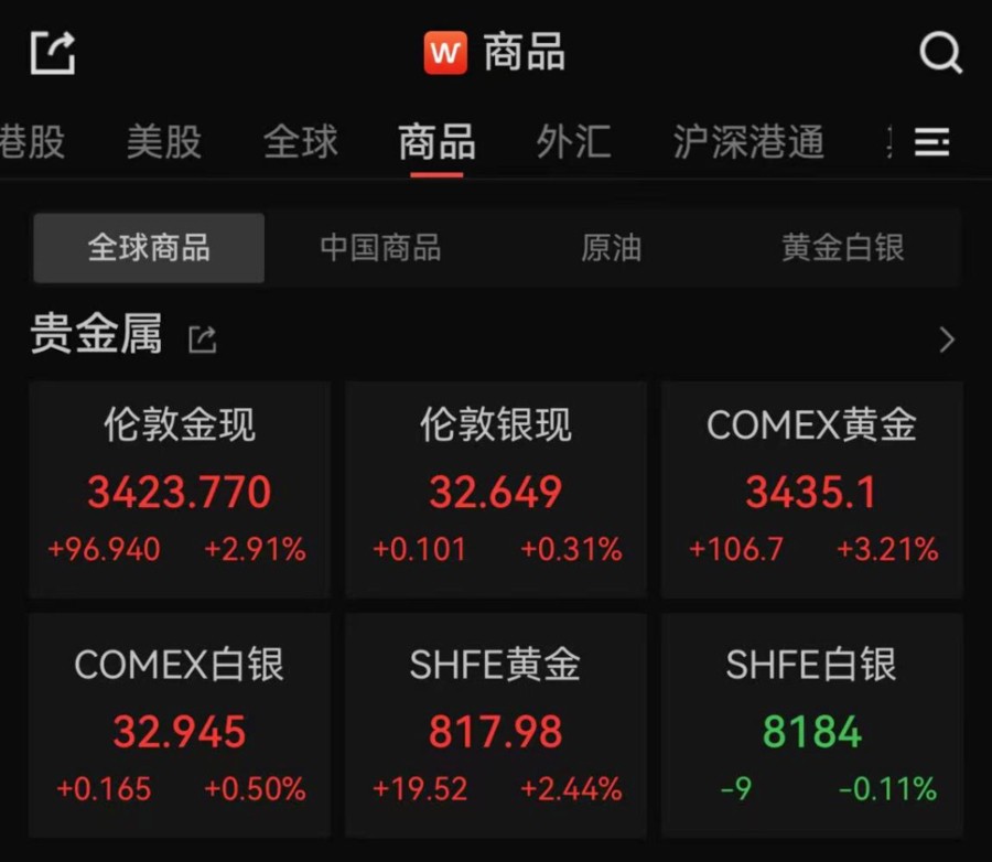 商品市场方面,现货黄金上涨2.91%,报3423.770美元/盎司,盘中站上3430美元/盎司,再创历史新高;COMEX黄金期货上涨3.21%,报3435.1美元/盎司,创历史新高。