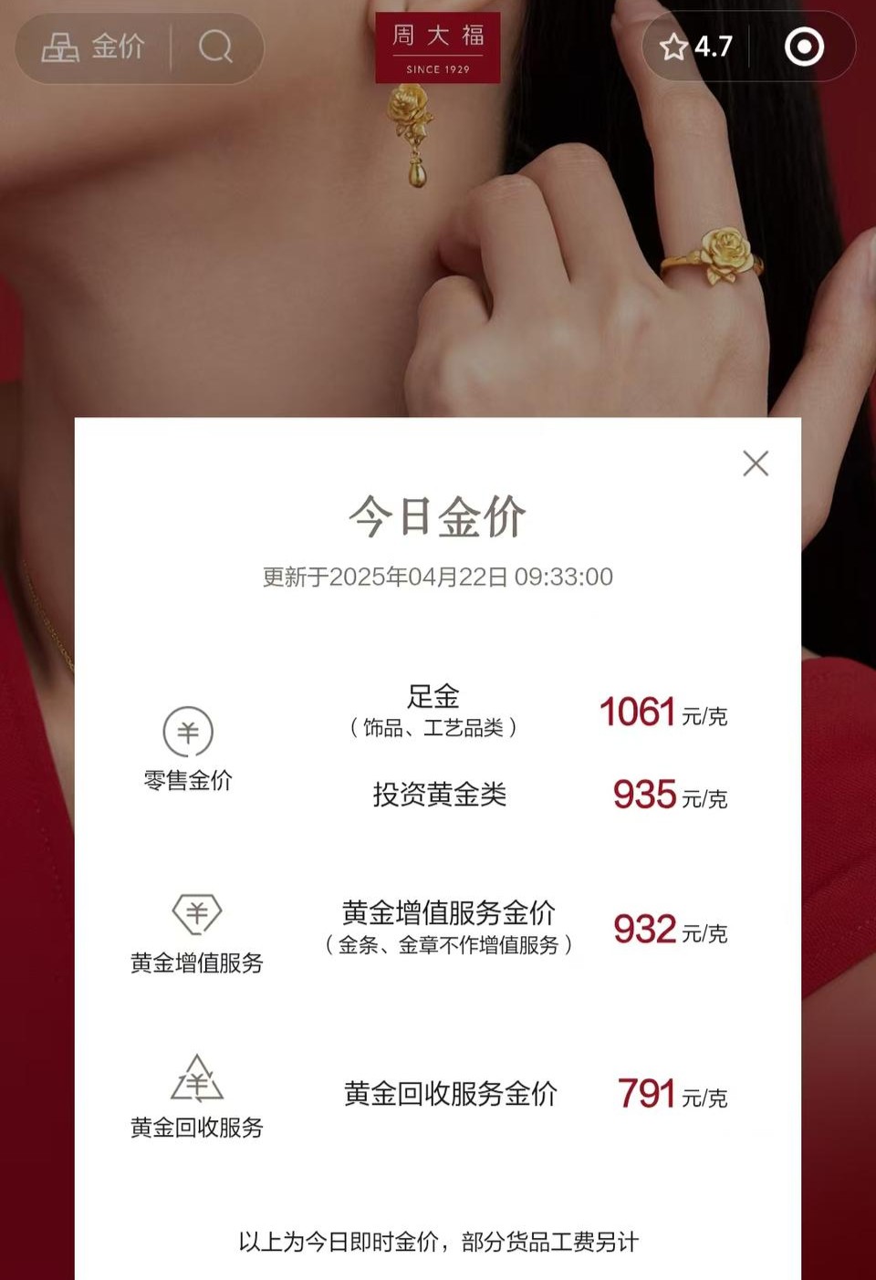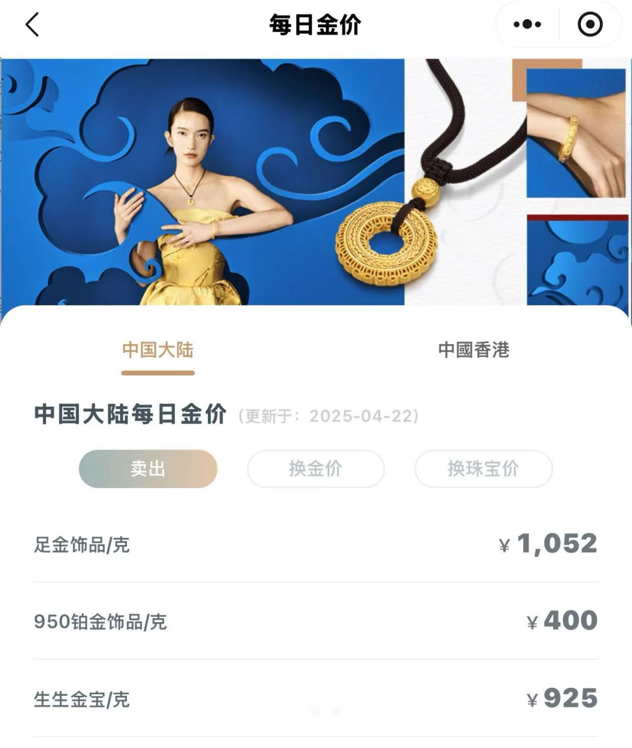 4月22日,多家品牌金店足金饰品报价已逼近每克1060元。