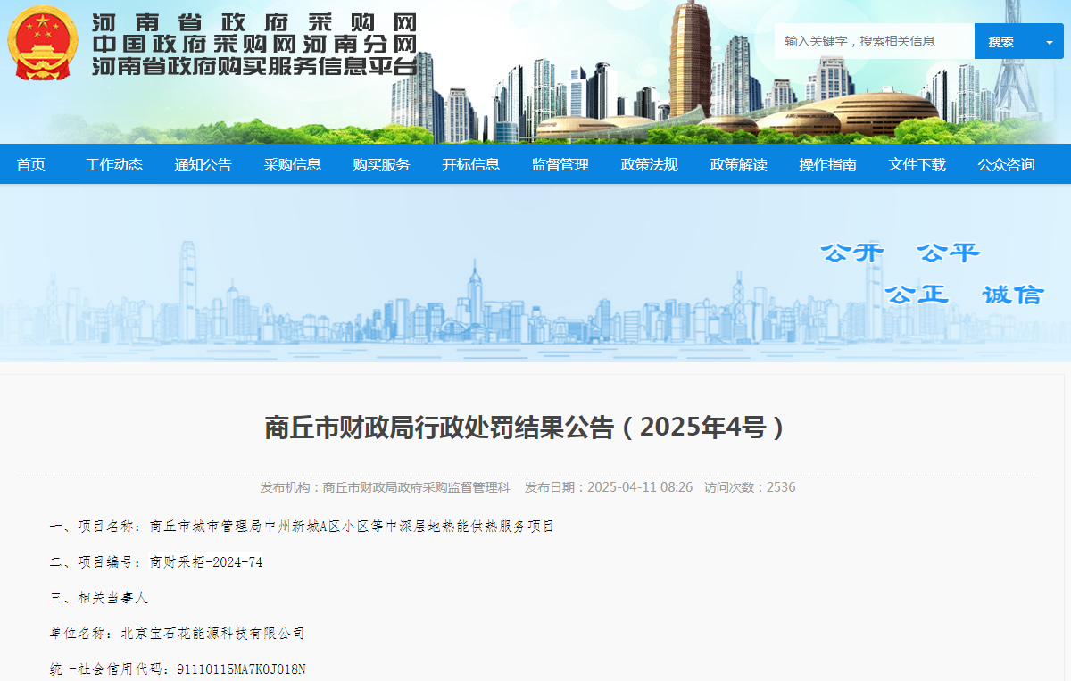 齐鲁晚报·齐鲁壹点记者于河南省政府采购网行政处罚栏了解到,近日,商丘市财政局发布了行政处罚结果公告(2025年4号),宝石花家园生活服务集团旗下的北京宝石花能源科技有限公司(下称“宝石花能源”)被罚,所涉项目名称为:商丘市城市管理局中州新城A区小区等中深层地热能供热服务项目。