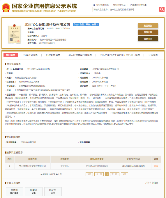 国家企业信用信息公示系统显示,北京宝石花能源科技有限公司成立于2022年,注册资本4180万元人民币,法定代表人为辛建中,由宝石花家园生活服务集团有限公司全资持股。宝石花家园生活服务集团有限公司则成立于2018年,注册资本50000万元人民币,法定代表人为武吉伟,大股东为碧桂园服务(06098.HK)。