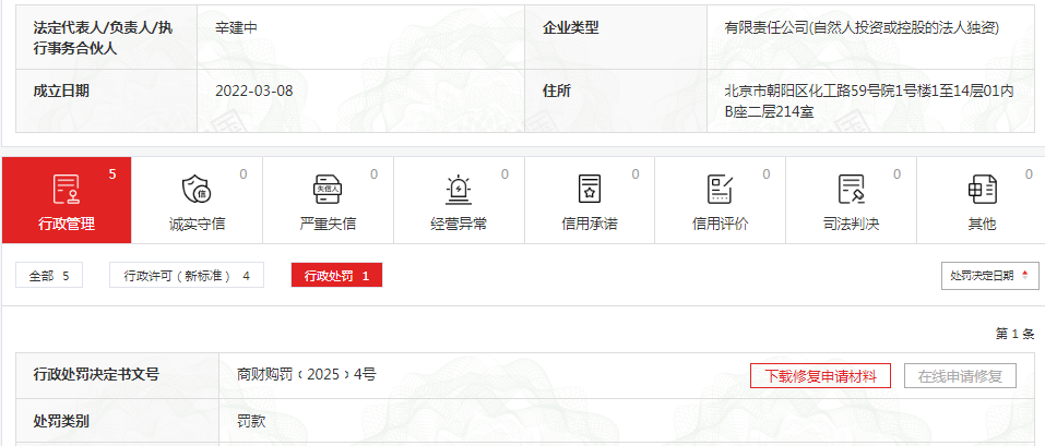 对此,依据《中华人民共和国政府采购法》第七十七条第一款和《中华人民共和国行政处罚法》第五条第二款、第六条的规定,参照《河南省财政行政处罚裁量基准》,商丘市财政局决定对该公司作出罚款采购金额千分之五,即人民币贰拾肆万零壹佰元(¥240100元)的行政处罚。记者查询信用中国官网了解到,其行政处罚决定书文号为商财购罚﹝2025﹞4号。
