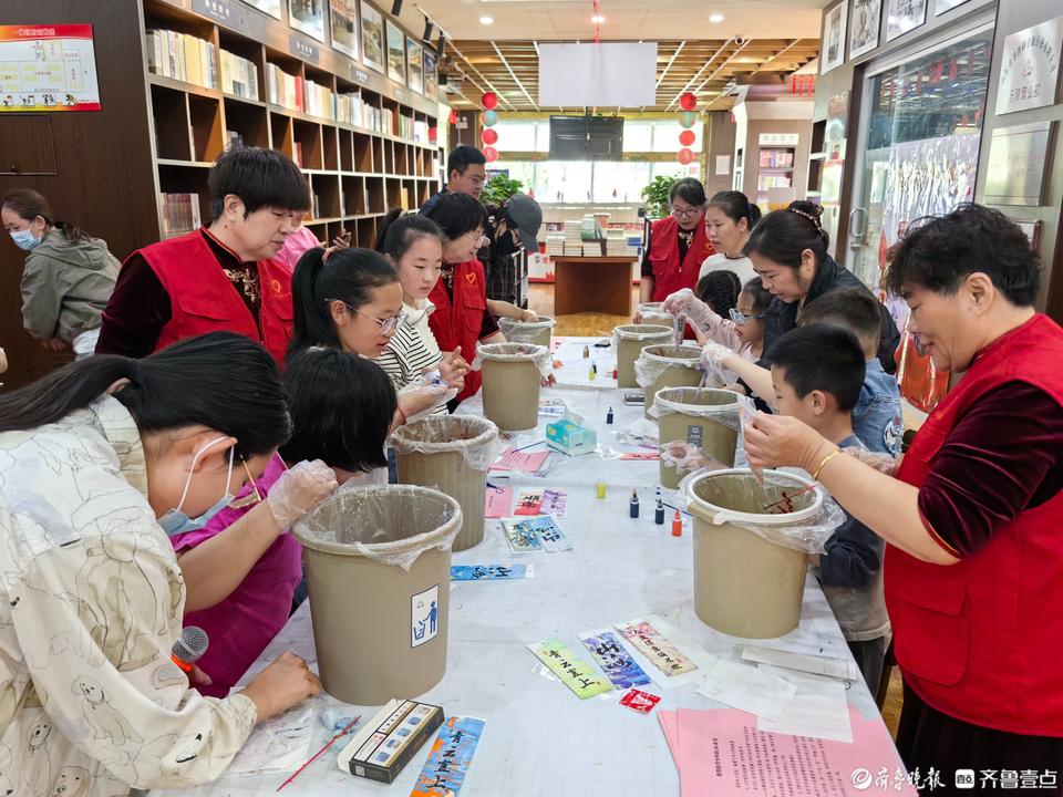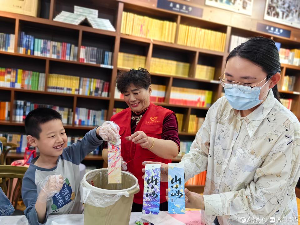 随后,大家还一起进行了漂漆书签手工制作。老少读者们共同创作,将五彩斑斓的漆料滴入水中,用独特的技法制作出独一无二的书签。