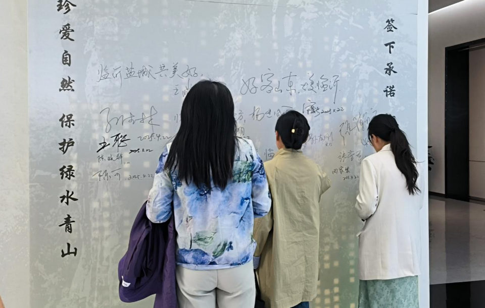 除此之外,展厅中还处处透着“保护地球”的“小巧思”。循环播放的《行动让地球家园更美丽》主题纪录片,让观众“沉浸式”感受自然与城市的共生之美;展馆外,一幅幅海报生动展示垃圾分类、低碳出行等环保知识;巨型签名墙上,“珍爱地球,人与自然和谐共生”的标语醒目而有力,引得参观者纷纷驻足签名承诺;就连洗手间的电子屏上,也循环播放着节水公益短片,“拧紧水龙头,留住生命之源”的温馨提示,让生态保护理念渗透到每个细节。
