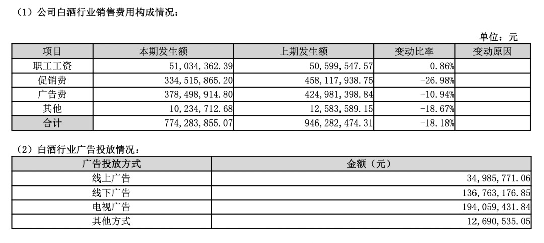 从年报中看出,牛栏山在过去的一年可谓是“过紧日子”,尤其是大幅度降低了营销费用。2024年报显示,其白酒整体销售费用减少18.18%,尤其是广告费减少10.94%,促销费用减少27%。