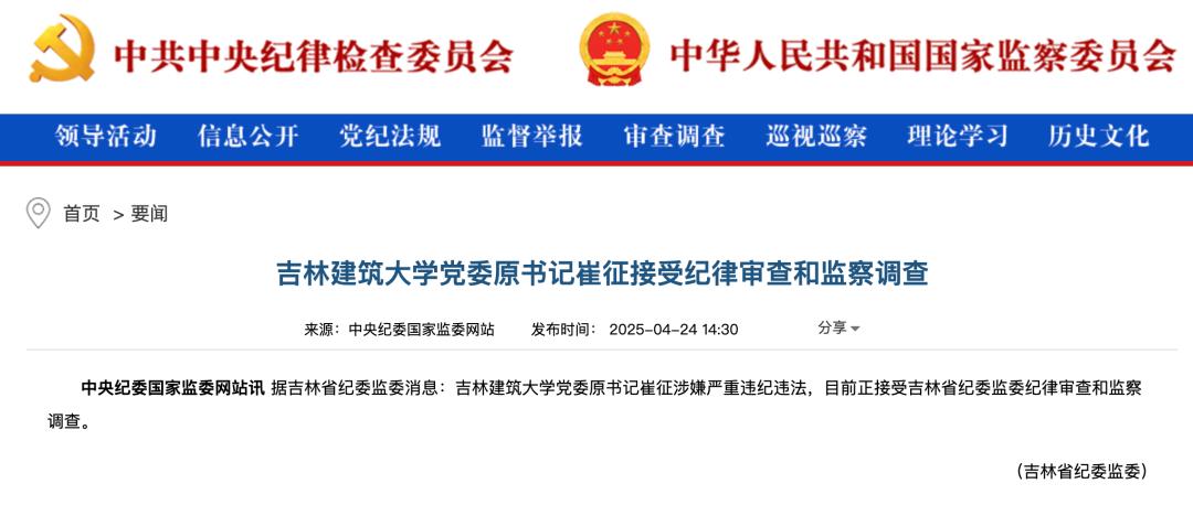 据吉林省纪委监委4月24日消息,吉林建筑大学党委原书记崔征涉嫌严重违纪违法,目前正接受吉林省纪委监委纪律审查和监察调查。