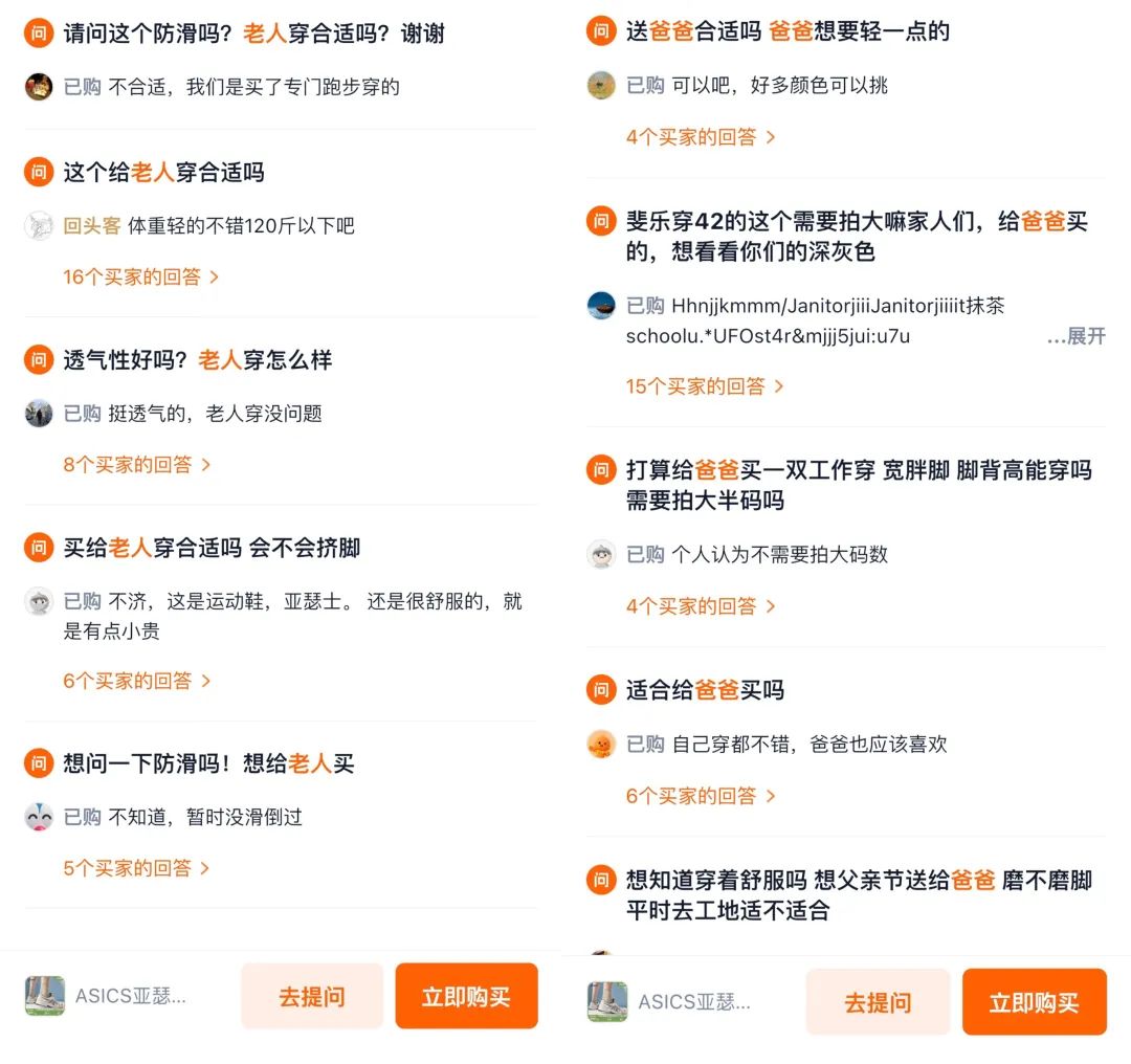 在天猫asics官方旗舰店,亚瑟士销量第一的contend 4跑鞋提问区,“送爸爸” “老人穿合适吗”相关问题多集中于2023年及以前。