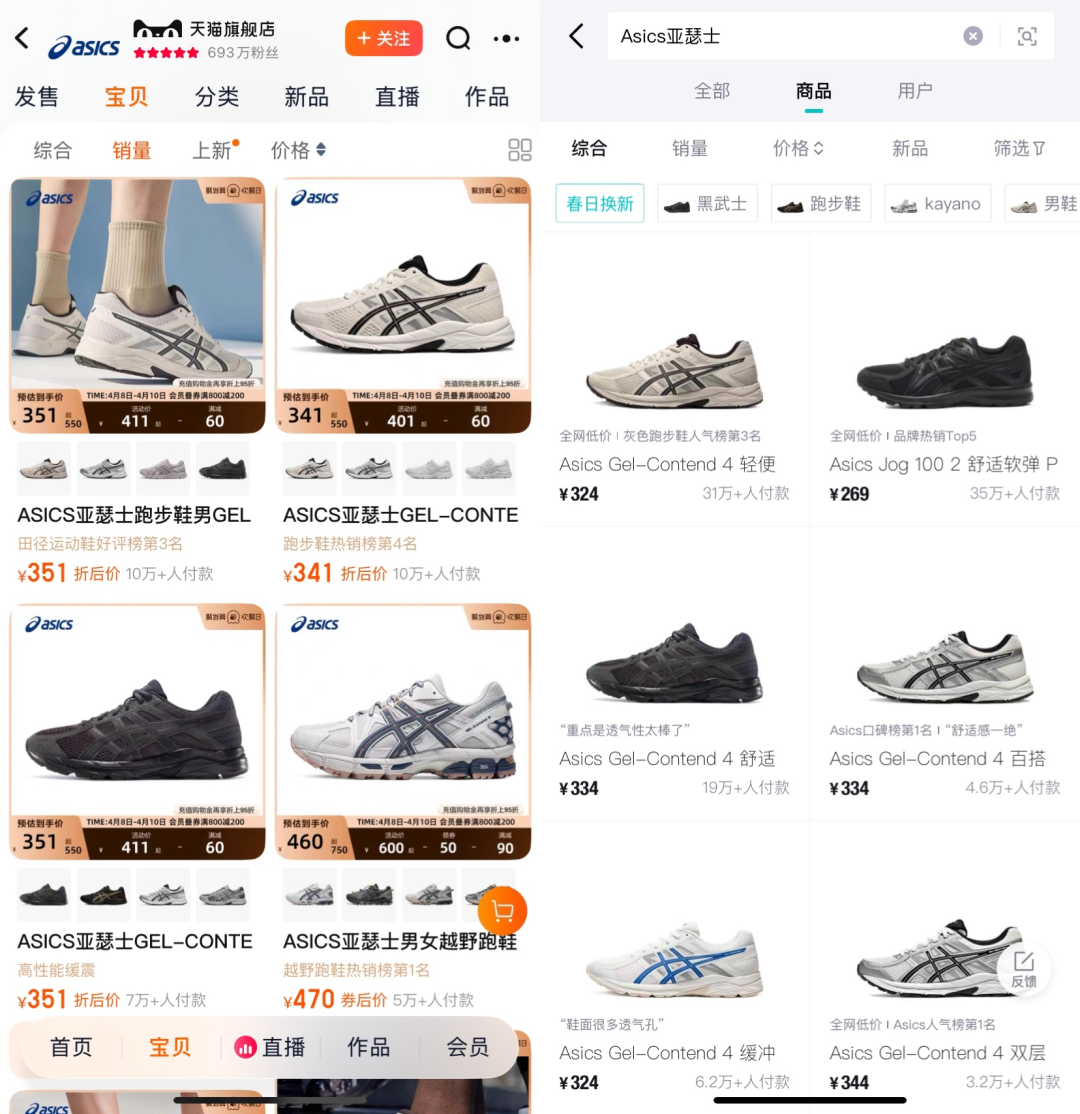 映射到销量,在天猫asics官方旗舰店,亚瑟士销量第一的contend 4跑鞋单链接已售10万+双。在得物,这款鞋“最近购买”已达到31万双。