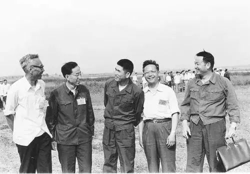 左起:现场总指挥管德、发动机总师温俊峰、试飞员曲学仁、总设计师顾诵芬、首飞指挥员王昂