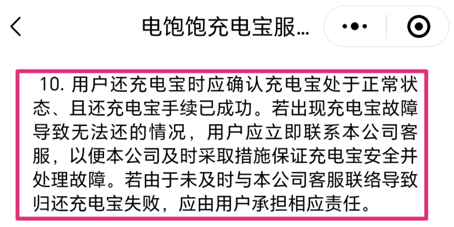 调查发现,电饱饱品牌存在涉嫌责任规避的不公平格式条款,其在《用户协议》规定,若出现设备故障无法归还,且用户未及时与公司客服联络导致归还失败,则由用户承担相应责任。