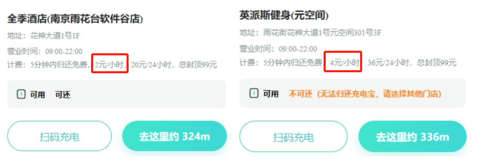 调查发现,位于江苏省南京市花神大道1号的同一品牌共享充电宝,放置在1F商户的收费标准是2元/小时,而放置在3F商户的价格却达到了4元/小时,并且单日封顶费用也有所不同。