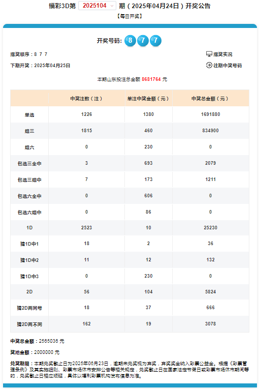 2025年4月24日,3D游戏第2025104期开奖,3D游戏派奖活动的第四期,当期中奖号码为877。
