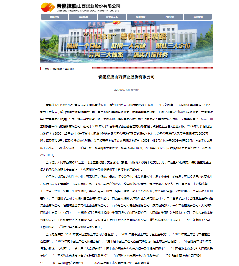 晋控煤业官网显示,公司是由大同煤矿集团有限责任公司为主发起人,联合中国中煤能源集团公司、秦皇岛港务集团有限公司、中国华能集团公司、上海宝钢国际经济贸易有限公司、大同同铁实业发展集团有限责任公司、煤炭科学研究总院、大同市地方煤炭集团有限公司等七家发起人共同发起设立的一个集煤炭生产、洗选、加工和销售一体化的股份有限公司。