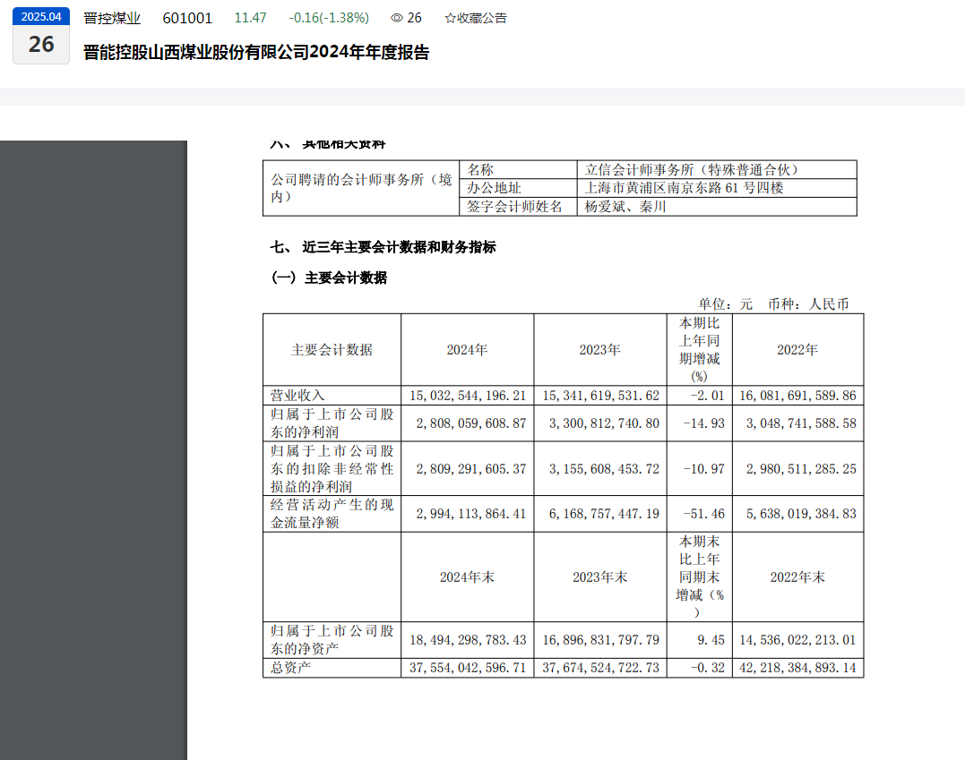 4月26日,晋能控股山西煤业股份有限公司(以下简称“晋控煤业”公司代码:601001)发布2024年年度报告。